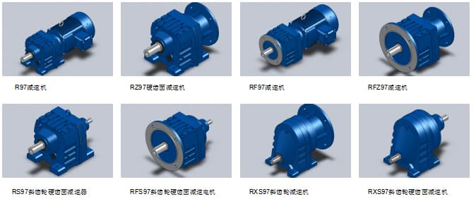 r97减速器产品概述 1、R97减速机结合国际德国技术要求制造,具有很高的科技含量; 2、斜齿轮硬齿面减速机有节省空间,高寿命,承受过载能力强,更大功率可达160KW; 3、低能耗,性能优,效率高达96%以上; 4、R系列斜齿轮硬齿面减速机选用优质钢材料,球磨铸铁箱体,齿轮表面经过渗碳处理。 5、可灵活性的配对各种电机,如伺服电机,三相异步电机,直流电机等。